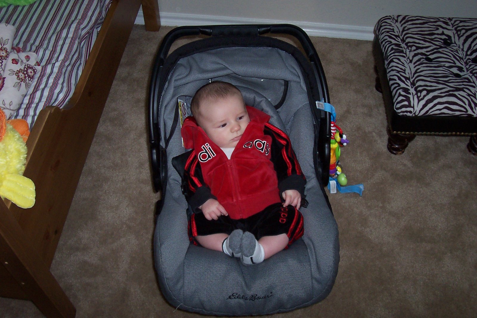 Jack is not spending too much time in his beautiful crib. He sleeps in his bassinet and in the bed with us. Since I have been back to work he has been waking up every few hours and he has been sleeping in the bed with us more often. He is getting use to it and doesn't like being put back in his bassinet. I really don't have the energy to fight it. He was sleeping through the night and now it has been three weeks since I had a full nights sleep. It would have been a lot easier if he had never slept through the night because I would not be expecting it. Oh well, I am sure it will all change again soon. Just when I get used to one thing he starts something new to keep me on my toes.